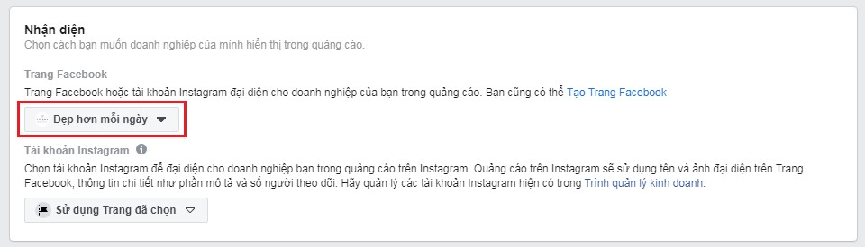 - Chọn Fanpage đại diện cho quảng cáo.